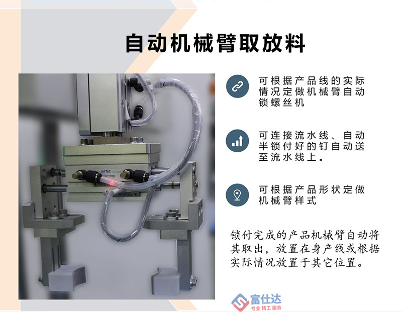富仕達擁有獨立研發(fā)設計團隊600多位自動化高級工程師,5000㎡自動鎖螺絲機生產、測試車間,專業(yè)售后服務團隊,為客戶提供方案設計、設備制造、操作培訓、售后服務等一站式服務。 公司將持續(xù)提升技術創(chuàng)新和產品服務方面的優(yōu)勢,堅持“專業(yè)、精工、服務”的企業(yè)理念,聚焦于自動鎖螺絲設備生產,通過系統的一站式解決方案,真正的幫助客戶提升效率、降低成本,提升客戶的核心競爭力。