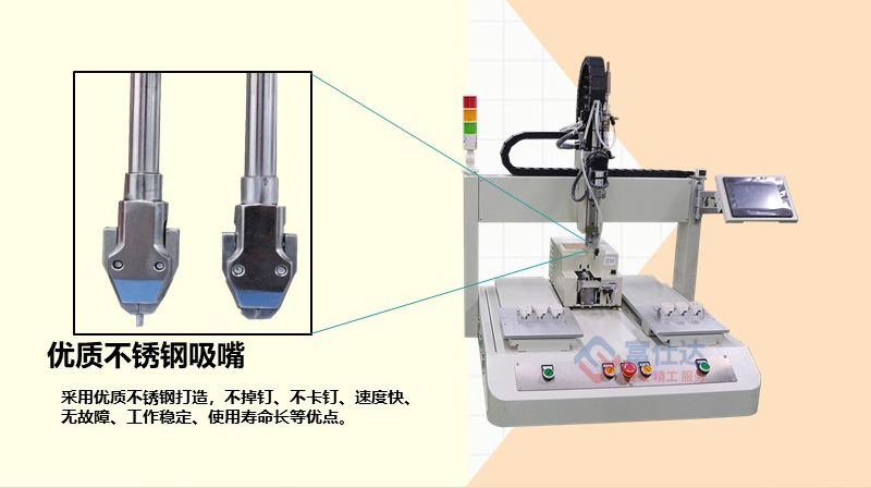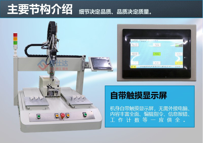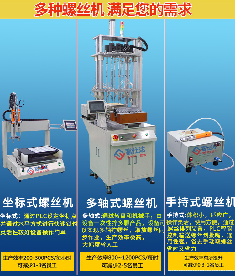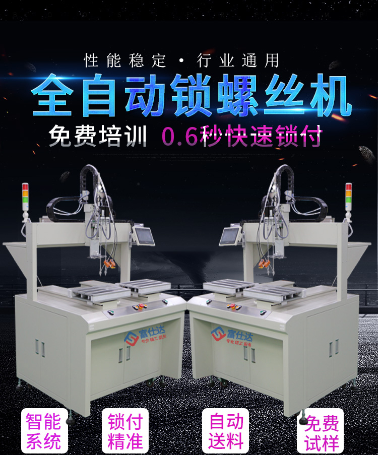 雙平臺坐標(biāo)式自動打螺絲機(jī),即富仕達(dá)雙工位全自動鎖螺絲機(jī),設(shè)備主要由自動送釘機(jī)、逐點(diǎn)鎖付系統(tǒng)、PLC控制系統(tǒng)、鎖螺絲機(jī)智能控制程序等構(gòu)成,通過對產(chǎn)品螺絲孔位X\Y\Z三維坐標(biāo)點(diǎn)位,執(zhí)行鎖付系統(tǒng)定位,重復(fù)定位精度較高:±0.02mm,適合螺絲密集型產(chǎn)品及型號多樣產(chǎn)品生產(chǎn)要求。
