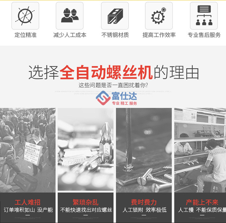 富仕達(dá)擁有獨(dú)立研發(fā)設(shè)計(jì)團(tuán)隊(duì),200多位自動化高級工程師,5000㎡自動鎖螺絲機(jī)生產(chǎn)、測試車間,專業(yè)售后服務(wù)團(tuán)隊(duì),為客戶提供方案設(shè)計(jì)、設(shè)備制造、操作培訓(xùn)、售后服務(wù)等一站式服務(wù)。 公司將持續(xù)提升技術(shù)創(chuàng)新和產(chǎn)品服務(wù)方面的優(yōu)勢,堅(jiān)持“專業(yè)、精工、服務(wù)”的企業(yè)理念,聚焦于自動鎖螺絲設(shè)備生產(chǎn),通過系統(tǒng)的一站式解決方案,真正的幫助客戶提升效率、降低成本,提升客戶的核心競爭力。