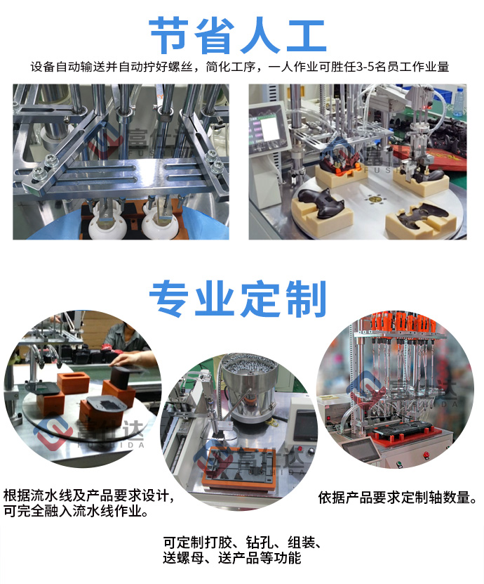 罩極風(fēng)機(jī)外殼采用6顆螺絲緊固,這里配置3臺自動送釘機(jī),并設(shè)計專用治具來固定工件,保證鎖付標(biāo)準(zhǔn)。設(shè)備可一次自動擰好產(chǎn)品的6顆螺絲,轉(zhuǎn)臺可實現(xiàn)多工位同步作業(yè),擰好一件產(chǎn)品僅需3秒左右,一人作業(yè)即可,可節(jié)省3-5名員工。